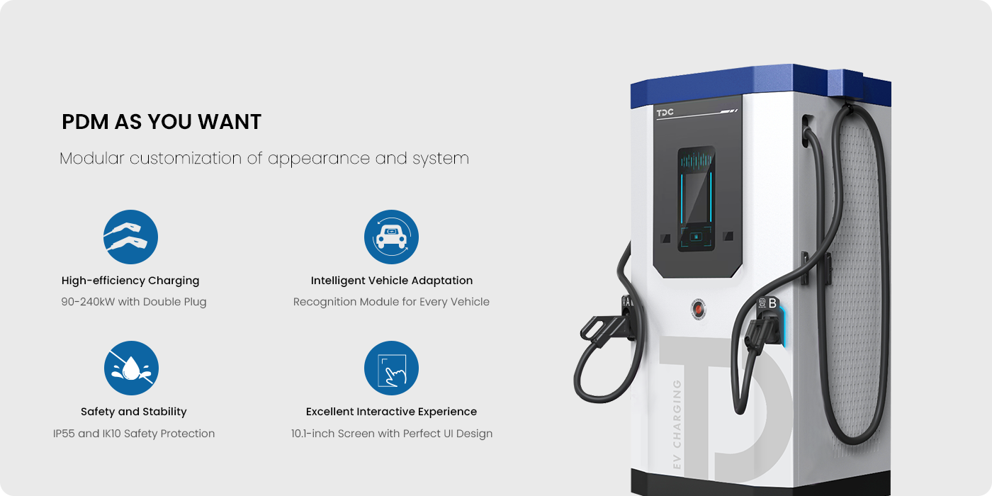 240kW high power output with double gun, PDM ensures rapid and efficient charging for a wide ranges of EVs, making it an ideal choice for businesses, and public charging stations.