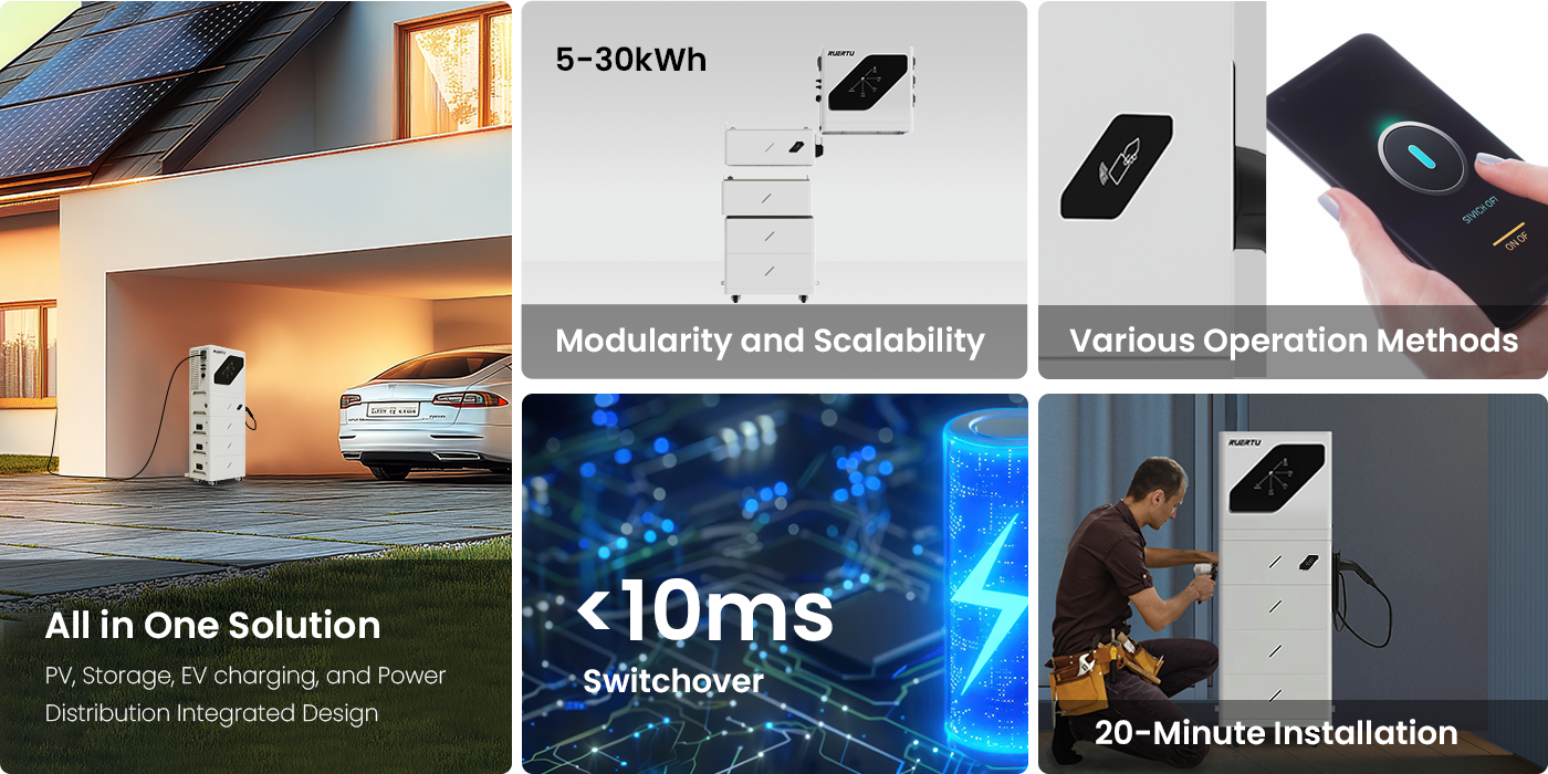 The Ruertu energy system includes a comprehensive set of components: solar panels, inverters, power stations, energy storage systems, and EV chargers. This all-in-one solution is designed to meet your energy needs efficiently and reliably.