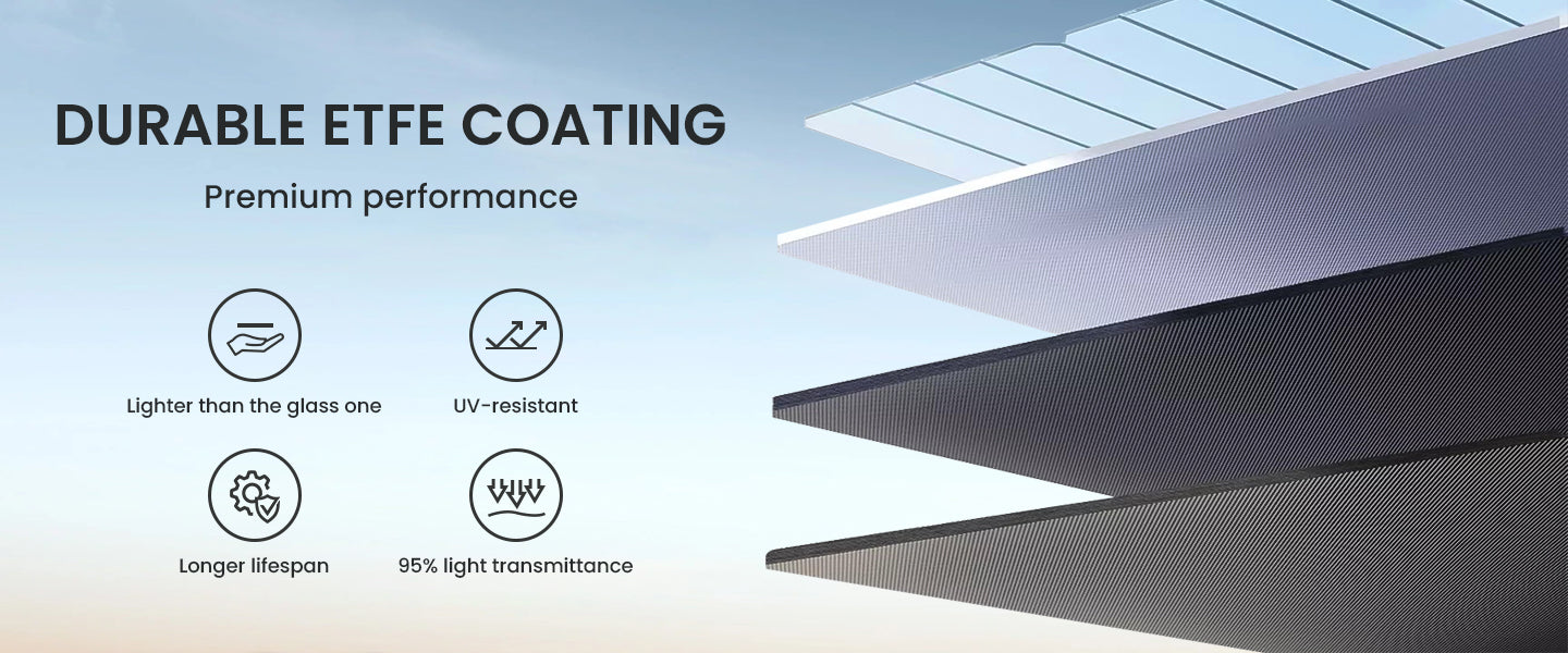 RG100 solar panel has an IP68 waterproof rating and is suitable for installation and use in various outdoor environments. Its panel is made of ETFE coating material, which has excellent weather resistance and corrosion resistance and can withstand daily wind, rain and ultraviolet radiation, ensuring the long-term stability of the panel.